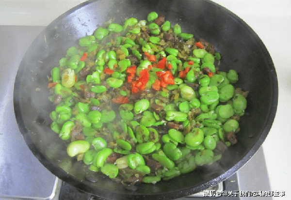 3、倒入焯過水的蠶豆米,繼續翻炒1分鐘,食材都熟透後加入適量食鹽調味,翻炒均勻後加入小米椒圈,翻炒均勻後即可出鍋。