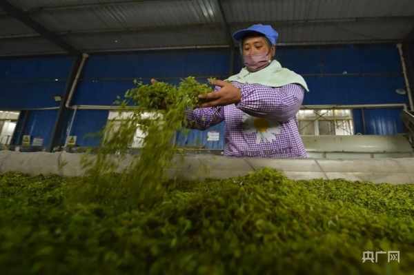 村民們將新采的茶青交付給企業後,即可憑著票據領取現金。茶葉加工廠飄散出濃鬱的茶香,村民們在生產線上忙碌著。新茶在經過攤青、理條、炒幹等工序後,被加工成翠芽茶和毛峰茶。