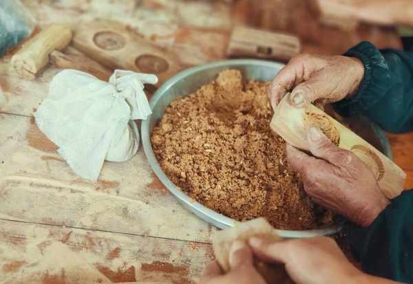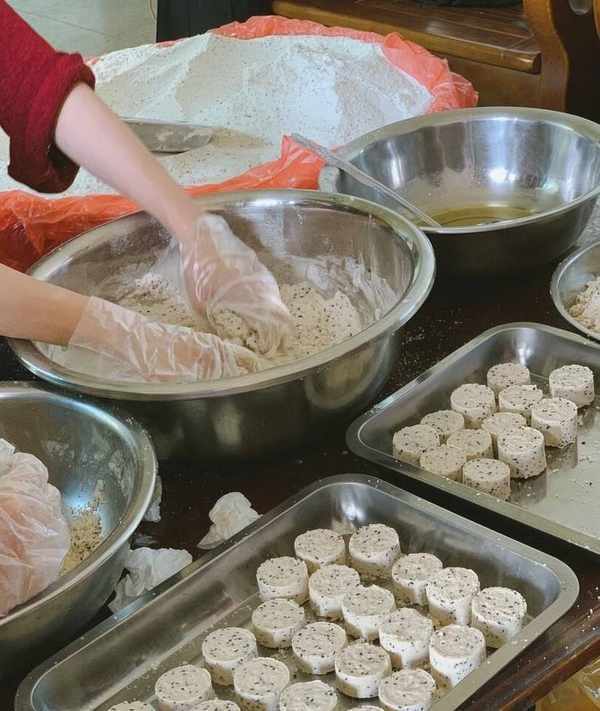 炒米餅的面團也有很多講究,因為面團太濕炒米餅烘幹後則變得太硬,面團太幹,炒米餅烘幹後則太松散不成形。