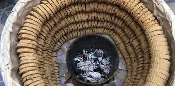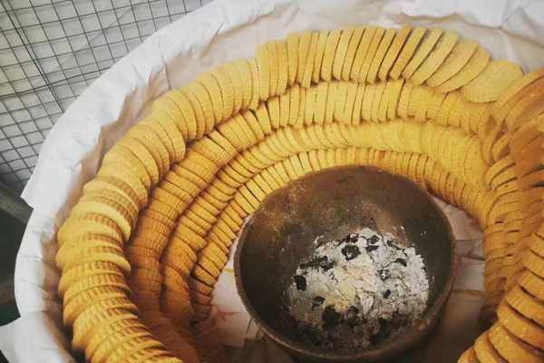 傳統做法用一隻籮筐,壓好的炒米餅沿著籮筐一圈圈疊放好,籮筐底部中間處用鐵盤放入幾塊木炭,點燃木炭用微弱的炭火蓋上蓋子慢烤8小時以上,中途把上面的炒米餅換到底下,底下換到上面。這樣可達到均勻受熱的作用。