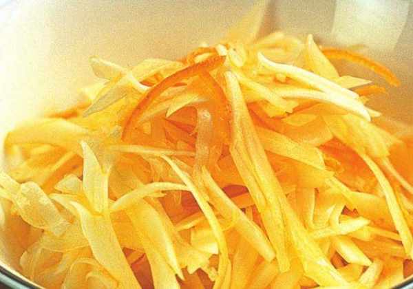 材料:大白菜嫩幫500克,橘子皮20克,檸檬汁適量,精鹽少許,白糖、白醋各1小匙。