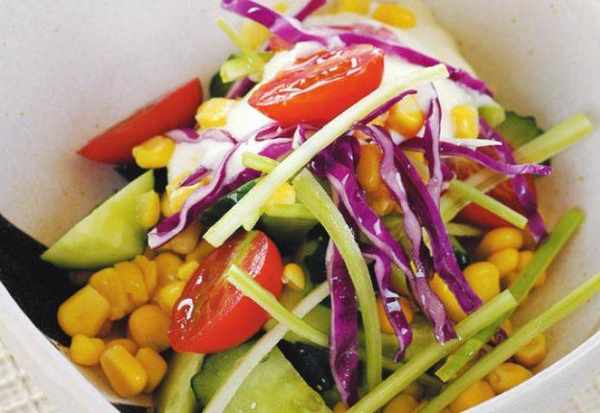材料:玉米粒(罐頭)100克,小西紅柿、紫甘藍、西芹、黃瓜各75克,精鹽少許,咸味沙拉醬2大匙。