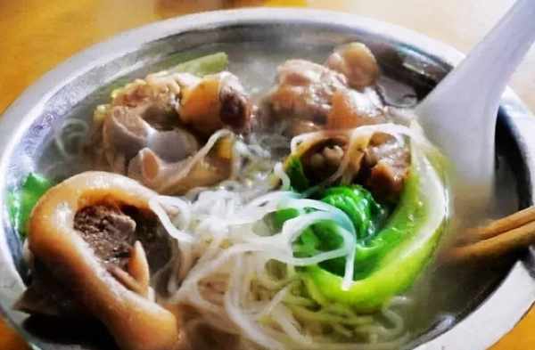 河源的豬腳粉,就如廣州的牛腩面一樣的普遍,在河源的大街小巷,你都可以找到賣豬腳粉的小店,店名幾乎都叫“河源豬腳粉”。豬腳有豐富的膠質,豬腳炸過再燒,皮比較筋道且不油膩,優點是湯汁不必勾芡也有黏稠度,米粉質地柔韌,富有彈性,水煮不糊湯,爽滑入味。