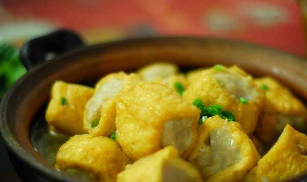 豆腐丸是河源人從小吃到大的小吃之一,在傳統的釀豆腐的基礎上改用油豆腐釀糯米,糯米的清甜搭配上香菇、土豆絲、蝦皮的不同口感,最大程度的體現食材的原汁原味。蒸熟後的油豆腐包裹著香糯的糯米,香菇和土豆絲點綴其中,風味獨特。