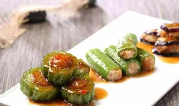 三寶分為:釀苦瓜、釀辣椒和釀茄子,制作的時候是把蝦米豬肉用刀剁碎,加入雞蛋,然後加調味料攪拌均勻,把餡料裝進苦瓜、辣椒和茄子裡進行釀制,三寶集於一盤,色澤各異,形態美觀,肉的香膩味融入到菜當中,味道獨特。