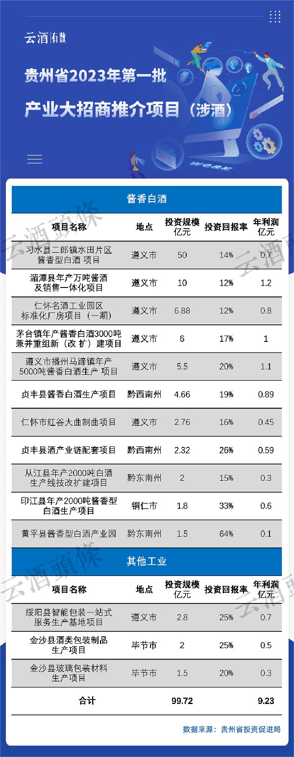 而打開《貴州省2023年第一批產業大招商推介項目索引》的目錄,醬香型白酒作為十大工業之首,以其高投資回報率和高利潤率成為瞭貴州招商引資的招牌之一。可以說,醬香型白酒長期以來都是維系粵黔兩地經濟紐帶的重要力量。這是由貴州和廣東兩地的實際情況決定的。
