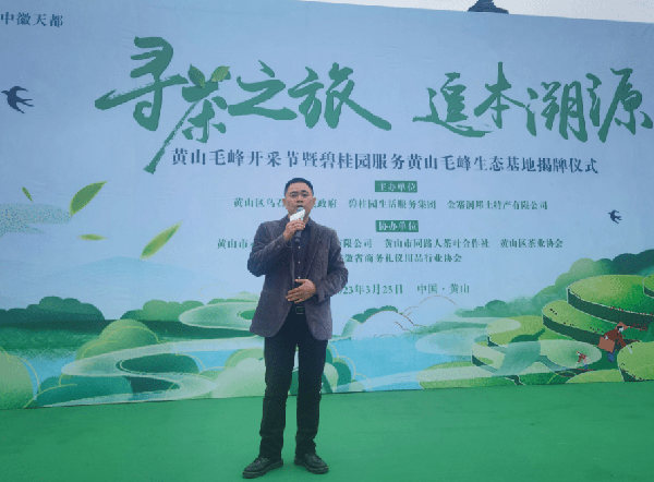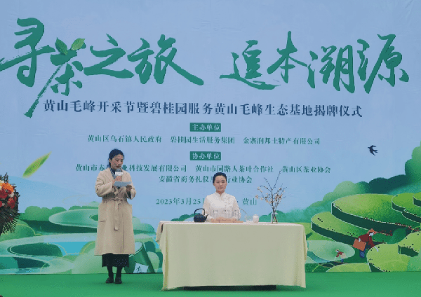 3月25日,2023安徽黃山毛峰開采節在黃山區烏石鎮地裡溪村舉行。本次活動由黃山區烏石鎮人民政府、碧桂園服務集團、金寨潤邦土特產有限公司聯合主辦,安徽省商務禮儀用品行業協會、黃山市赤赫農業科技發展有限公司、黃山市同路人茶葉合作社、黃山區茶業協會協辦。安徽省農產品質量監管處原處長耿繼光,安徽省綠色食品辦公室原副調研員、安徽省農產品質量安全管理站副原調研員李世國,黃山區烏石鎮黨委書記羅明,碧桂園服務集團副總裁潘品毅,碧桂園服務集團副總裁王修濤,碧桂園服務集團社區生活服務群負責人趙亭亭,金寨潤邦土特產有限公司董事長、中徽天都品牌負責人張宗祥等領導和嘉賓出席啟動儀式。
