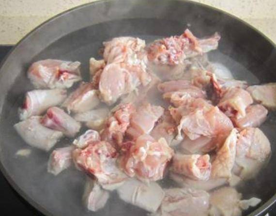 第三步:鍋中放冷水,放入雞肉,大火煮至泡沫和血水沸騰,將雞肉撈出瀝幹水分待用。