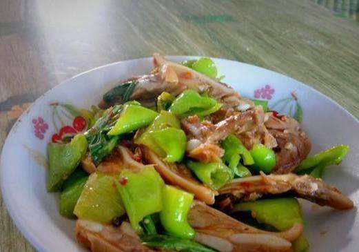 2、鍋裡放油,油熱下蒜苔翻炒,火不需太大,隻需翻炒幾下斷生即可,加適量鹽炒勻盛出。