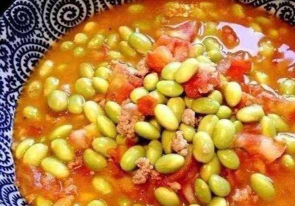 材料:新鮮毛豆、番茄、豬肉、薑末、鹽、料酒、生抽