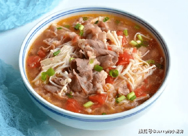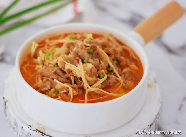 最後放入肥牛攪拌均勻,加入鹽、雞精調味。出鍋後撒些蔥花即可食用。