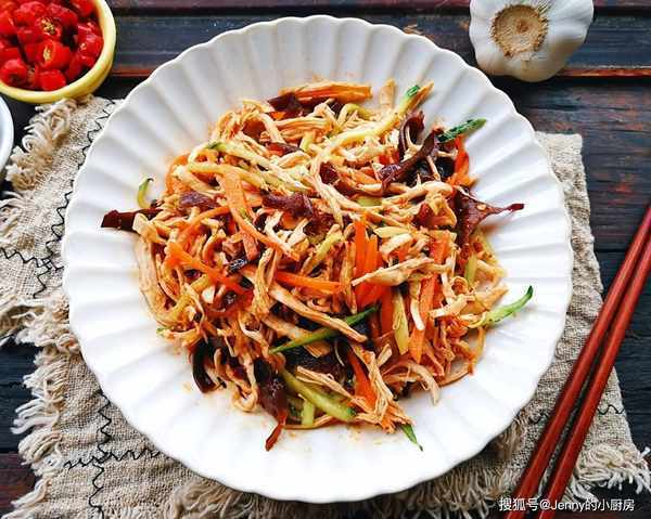 時間到後,用筷子紮一下雞胸肉,輕松紮透說明熟瞭,撈出晾涼。木耳泡好後洗凈,切成細絲。胡蘿卜去皮洗凈,切成細絲。