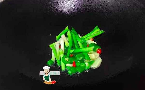 2、熱鍋涼油,下入大蒜和蒜苗頭、小米辣一起下鍋炒,把香味炒出來。