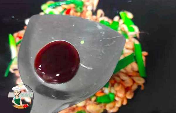 3、加入河蝦一起下鍋翻炒,河蝦炒至變色。下入少許的蠔油和生抽調味。