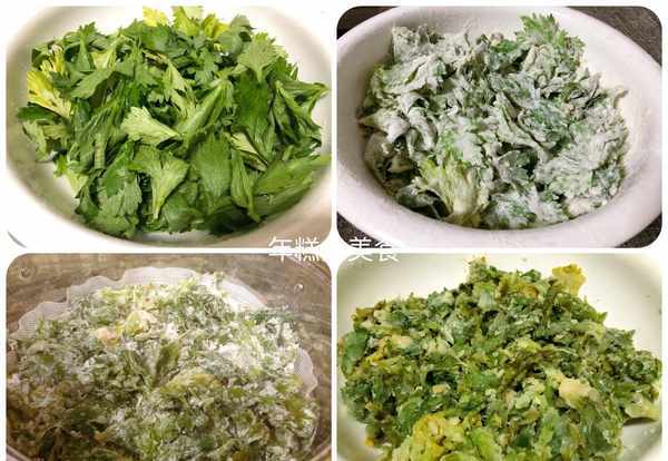 (3)然後再少量多次撒上面粉,用手抓散,盡量使每一片葉子都粘上面粉更好