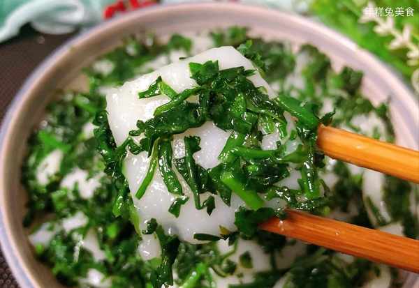 (5)鍋中燒油,依次倒入年糕、薺菜翻炒,然後放鹽和雞粉調一下味道,炒勻就出鍋