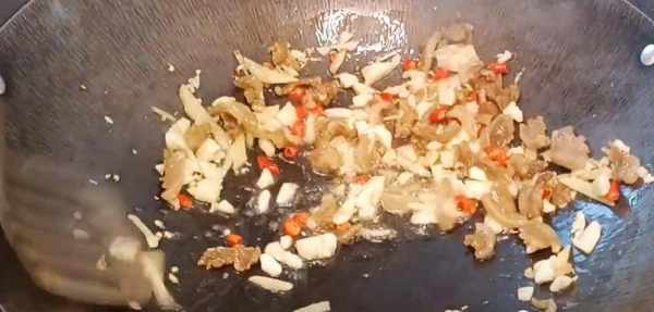 第3步、重新起鍋熱油,有豬油的最好用豬油,放入配料蒜末辣椒薑進行爆香,有油渣子的就放點,放油渣子炒會更香。