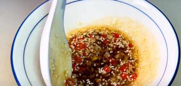 第4步、接著把醬料也準備一下,先放入蒜末辣椒芝麻淋入熱油爆香,再放生抽,雞精,白糖,陳醋進行調味。