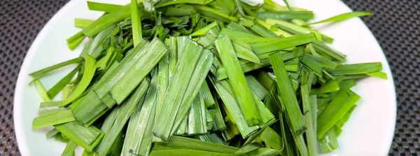 第1步、首先把韭菜清洗幹凈,然後切成韭菜段備用。