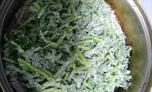 4、放玉米面,可以讓蒸菜的味道更好,顏色也更鮮亮,這是第二個秘訣。混合好後的粉,倒入茼蒿中,充分混合攪拌,直至茼蒿表面,都裹滿粉為止。接下來,往鍋內添水,待其燒開以後,在蒸籠上擺上一塊紗佈,把茼蒿分散著鋪上去。