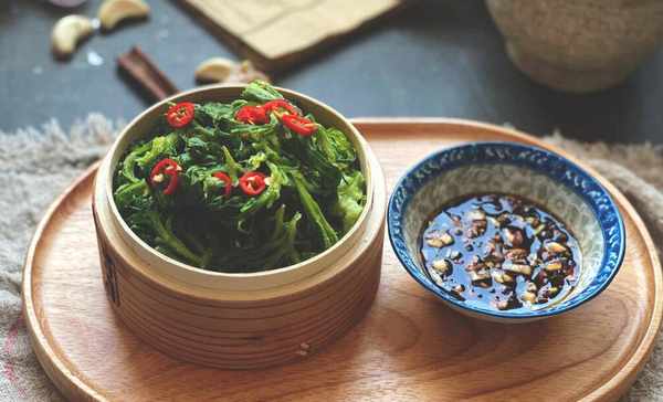 5、蓋上蓋子,大火蒸6、7分鐘的樣子,就能夠關火瞭,關火後掀開蓋子,將茼蒿取出來,分散鋪開晾涼,就可以吃啦。接下來教大傢一個料汁的做法,蒜蓉中加上鹽、雞精、生抽、醋、辣椒油、香油,將其攪拌一下,搞定。