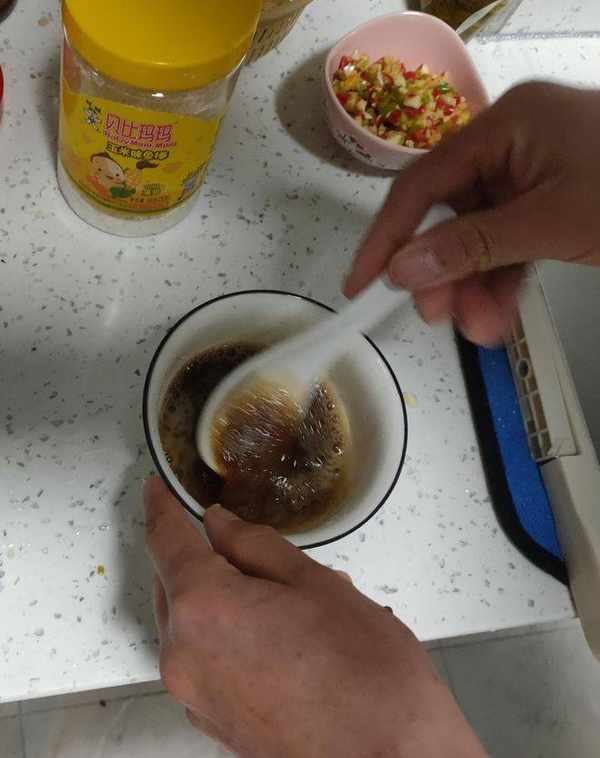 2.將薑、蒜、大蔥,切成粒,切好後調一個料汁醬油或者生抽一勺,香醋兩勺,耗油一點,白糖一平勺,淀粉一點,加幾勺清水,攪拌均勻備用