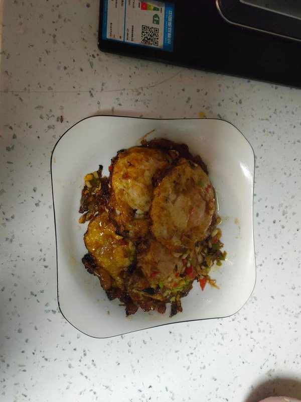 8.差不多煮一兩分鐘,就可以撒點蔥花,青紅辣椒粒,收幹汁水,酸酸甜甜的糖醋荷包蛋就做好嘍!美味極瞭!關火出鍋就可以,雞蛋這樣做可以吃2碗米飯。