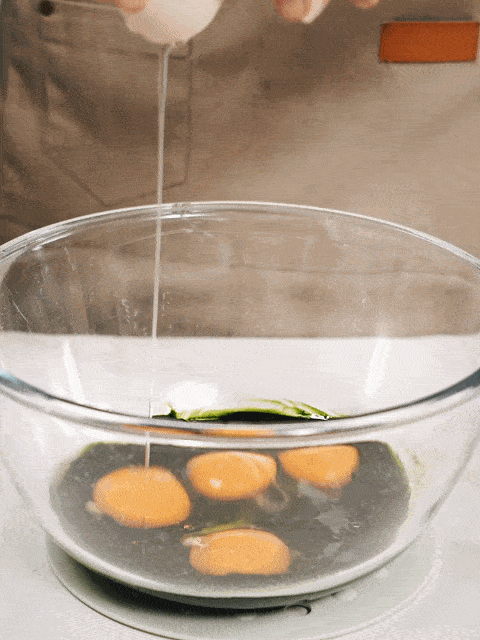 然後磕入4個大小在55克左右的雞蛋,混合均勻後,加入60g細砂糖、2.5g海鹽、30g蜂蜜混勻(蜂蜜這類液體糖,可以讓甜品口感更加柔和濕潤)