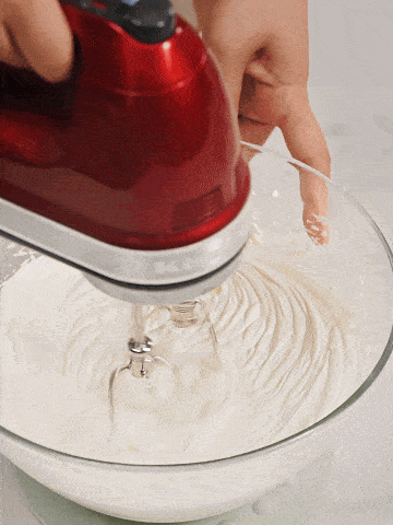 分次加入400g淡奶油,每次都攪拌至順滑,以免有奶油奶酪的顆粒沉底。等加完奶油後,保持中高速打發至紋路清晰的八成狀態。加入50g無糖濃稠酸奶,翻拌均勻就可以啦!裝入裱花袋備用