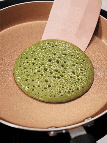 面糊表面會冒出豐富綿密的泡泡,並慢慢破掉,等到所有泡泡都破掉後,輕輕地起一下餅皮邊緣,然後翻過來,繼續小火加熱10-15秒即可出鍋