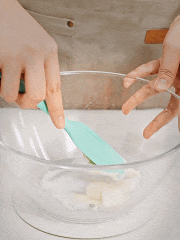 6、再來做酸奶奶油部分:碗中加入30g奶油奶酪和30g砂糖,先翻拌均勻以免攪打時砂糖飛濺,打蛋器低速攪打至順滑
