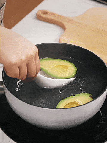 4、然後做牛油果餡部分:4個牛油果去核去皮,放入開水中燙煮10-20秒,放入冰水中降溫