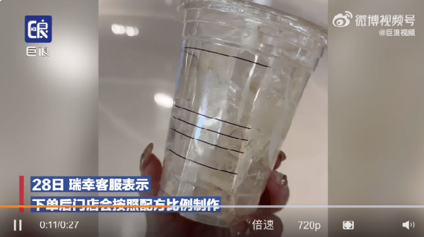 近日,山東菏澤一名女子發視頻稱,在瑞幸咖啡小程序買瞭一杯原價生椰拿鐵,喝瞭三四口就沒瞭,剩下大半杯全是冰。