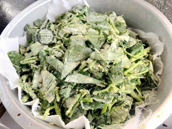 2、將裹上面粉的空心菜放入蒸屜中蒸制10分鐘後取出。