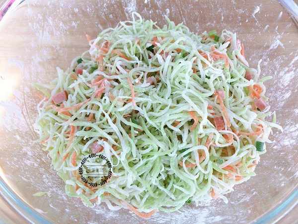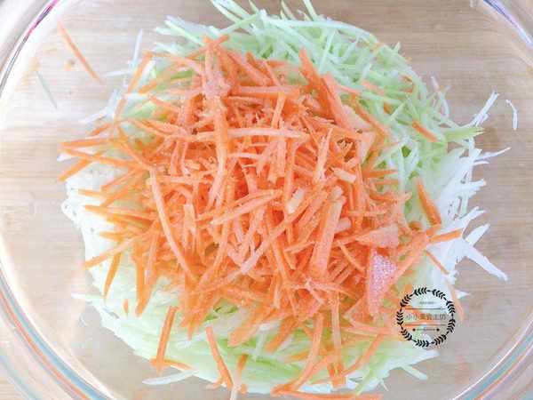 1、將青紅葫蘆洗凈後切成細絲,放入食鹽醃制出水分。