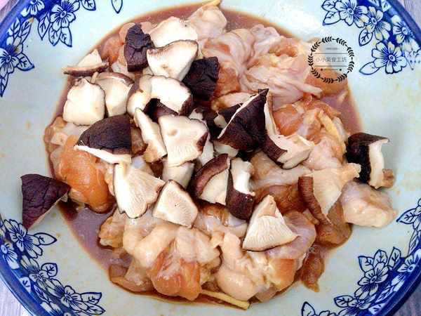2、幹香菇提前泡發,然後切成小塊,放入醃好的雞腿中。