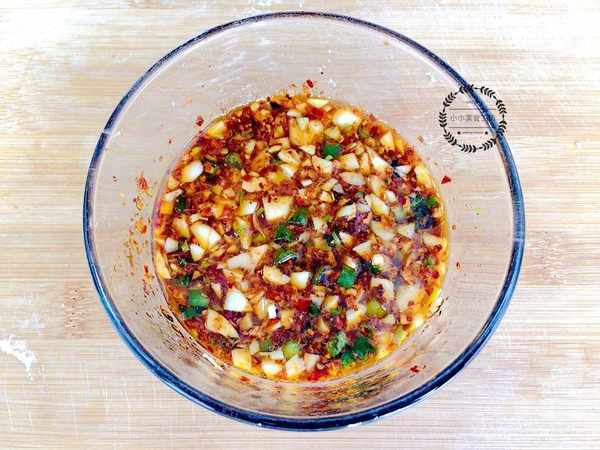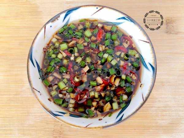 4、碗中加入蒜末,蔥花和辣椒碎,然後淋入熱油激發香味,再加入生抽,醋,食鹽,用蒸好的丸子蘸著這款調料,吃起來超級香。