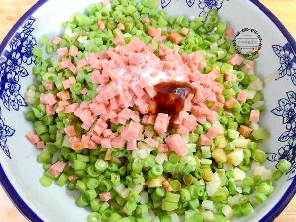 2、然後加入切丁的火腿腸和蔥花,再加入淀粉攪拌均勻。