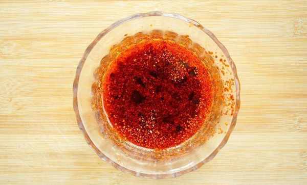 起鍋加入大量的菜籽油,油燒到冒煙就關火,等油溫降到四成熱的時候放入洋蔥和大蔥各3兩,一兩薑片,等鍋中出現小泡開文火炸至蔬菜焦黃,撈出菜渣,開中火到油溫180度再關火。將油分三次倒入搗細的香料中,第一次出香,第二次出色,第三次出辣。最後加50克高度白酒、一根揉碎的小蔥放一晚上。第二天就可以用它拌涼菜,炒菜,做燒烤。