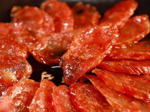 與一般的廣式臘腸制作方法多少有些不同。一般廣式臘腸瘦肉與肥肉的比例為7:3,而這“陳皮臘腸”的卻是按8:2的比例,而豬肉更是選用農傢花白土豬肉。