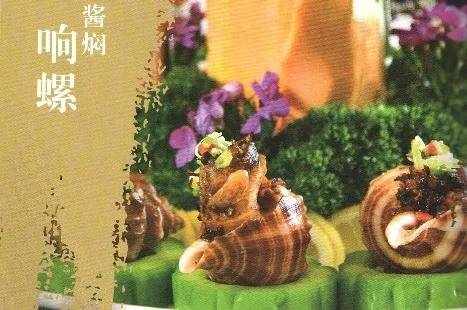 5、最後將螺肉重新釀入響螺殼內,淋上醬汁,撒上蔥花,把焯熟的苦瓜圈放在碟底,擺上響螺造形,一道美味的陳皮醬燜響螺就做好啦。