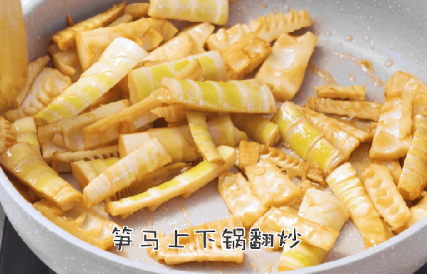 3、熱鍋放油,放入冰糖炒出糖色後放入春筍;