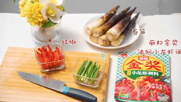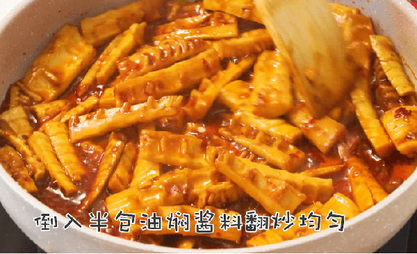 4、筍炒至熟透後加入廚邦油燜小龍蝦調料,這個是廚邦上一年新出的小龍蝦調料包,平時做菜想偷懶用它就不錯,有五個口味,調味很方便;