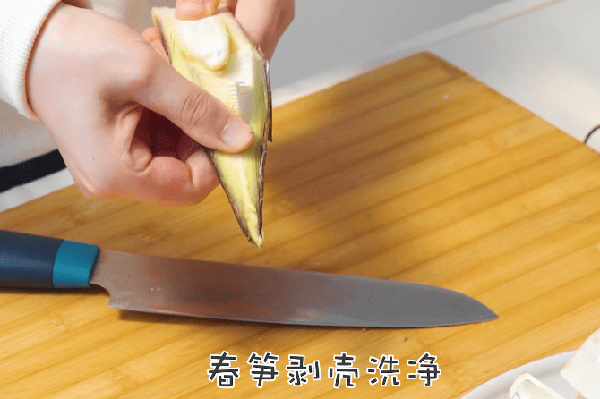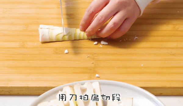 1、春筍剝殼洗凈,用刀拍扁切段;