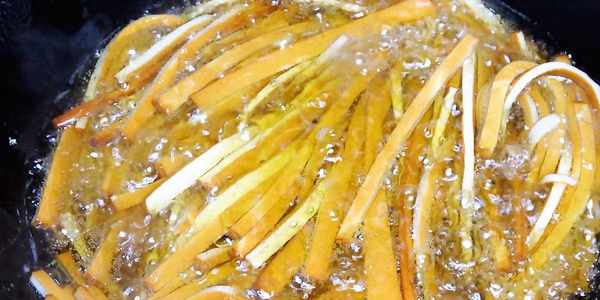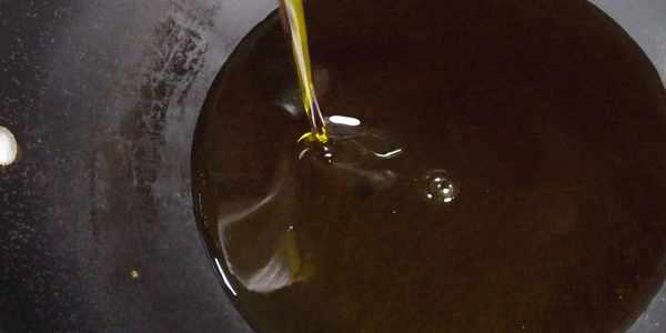 接著往鍋裡加入大量的植物油,我這裡用的是菜籽油,菜籽油做出來會更香一點。生菜油的話最好是燒開之後再冷到五成熱,因為生菜油有一股難聞又難吃的生菜油味。所謂菜油燒開,就是燒到鍋裡在網上冒青煙的時候,大約八成熱的油溫。其他植物油就直接燒熱到五成熱,也就是筷子下鍋之後冒小泡泡就可以瞭。