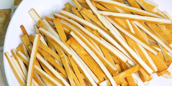 首先準備一些豆腐幹,豆腐幹的品種非常多,大傢可以根據自己的喜好選擇豆腐幹的品種。我這裡用的是四川很常見的煙熏豆腐幹。大傢選豆腐幹的時候,不管是什麼品種都一定要先聞一下,正常的好豆幹聞起來是有著非常香的豆香味,如果聞起來有刺鼻的氣味,說明豆幹已經壞瞭,還有一些豆幹,如果表面上有一些看起來粘乎乎的物質,這種豆幹多半也是已經變質瞭,最好不要買。