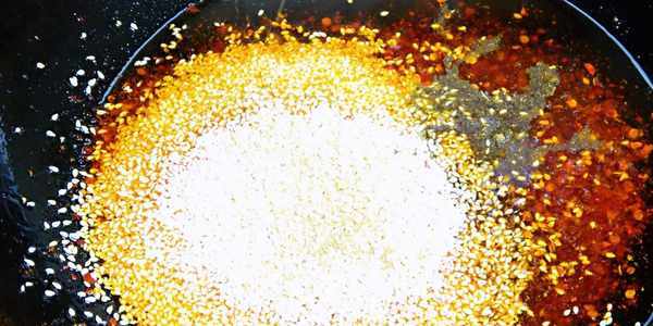 2分鐘後把炸好的豆幹起鍋備用。鍋裡留少許底油,先不要開火,加一些粗辣椒粉、一些細辣椒粉,這個辣椒是香而不辣的,所以辣椒看著多,其實並不辣。然後加一些孜然粉、一些花椒粉、一些白芝麻、少許五香粉,然後開小火把輔料炒香。