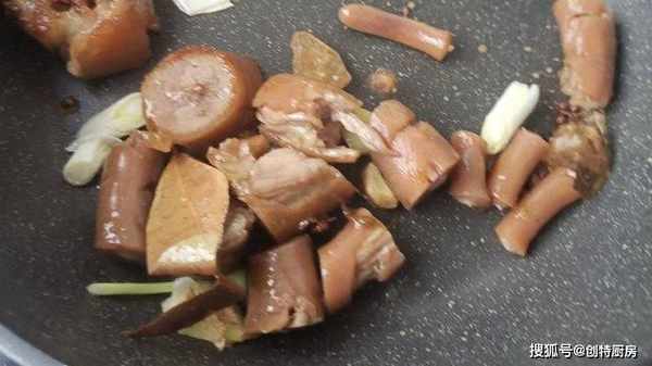 2、起鍋燒油,下入薑片、桂皮、八角、香葉爆香,然後下入解凍好的豬尾,翻炒均勻;
