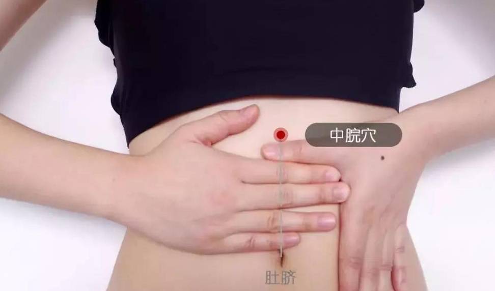 中脘穴位於肚臍上方5指處,此穴的主治疾病為:消化系統疾病,如腹脹、腹瀉、腹痛、腹鳴、吞酸、嘔吐、便秘、黃疸等,此外對一般胃病、食欲不振、目眩、耳鳴、青春痘、精力不濟、神經衰弱也很有效。用指腹對該穴位進行按壓,如果感到有胃蠕動感或聽到腸鳴更佳。多按摩此穴具有調和脾胃、順氣止痛的作用。
