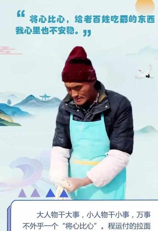 今天火爆全網的山東拉面哥,他叫程運付,來自山東臨沂費縣梁邱鎮馬蹄河村,他的工作是趕集出攤做拉面,一碗拉面隻賣3塊錢,15年來從未漲價。